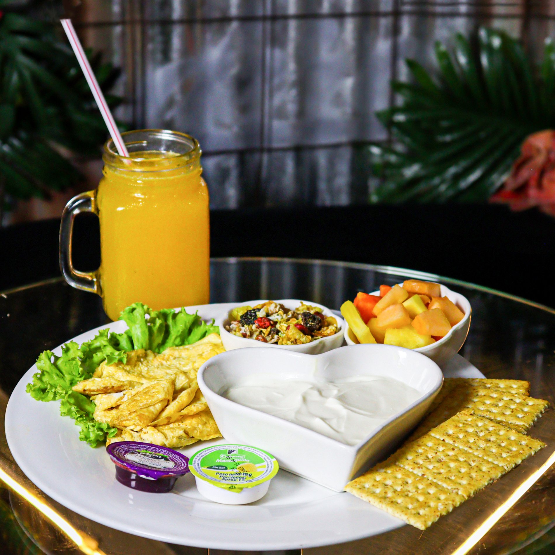 Homelet de clara de huevo, tostadas de pan integral, frutas, yogurt griego, y jugo natural.