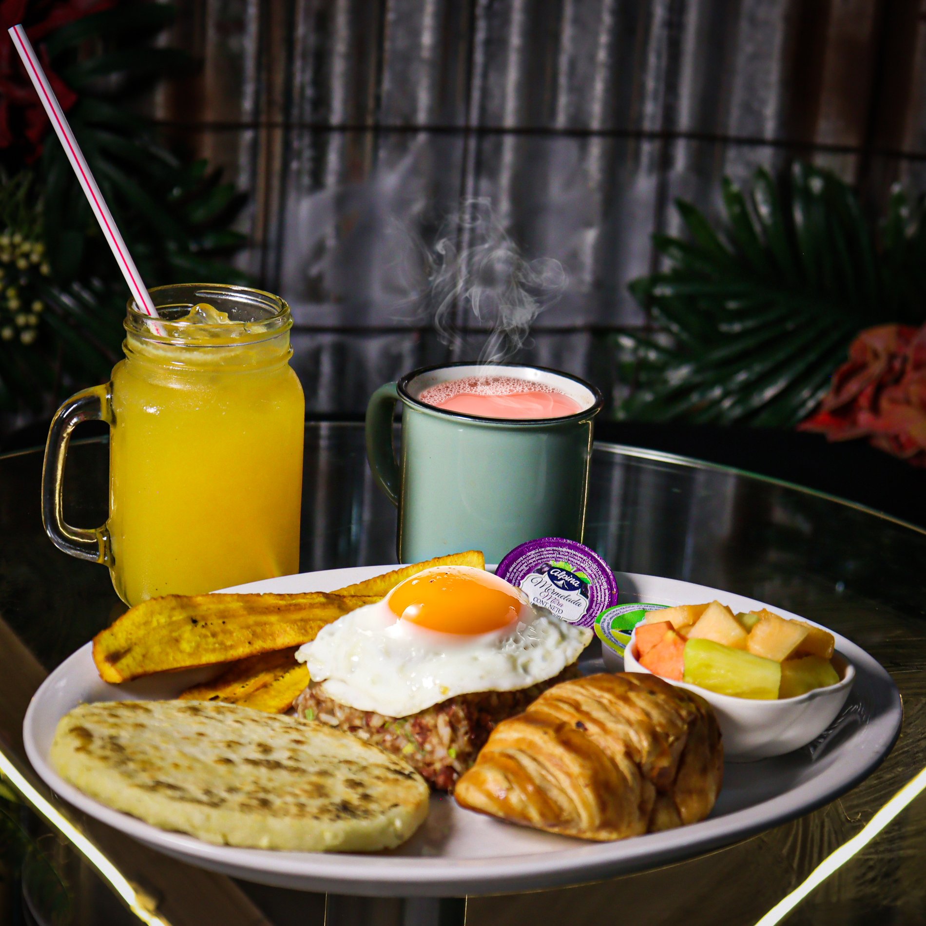 Huevo, avena con lecha de almendra y maní, arepa de avena, crepes con manzana y canela, porción de frutas y jugo natural