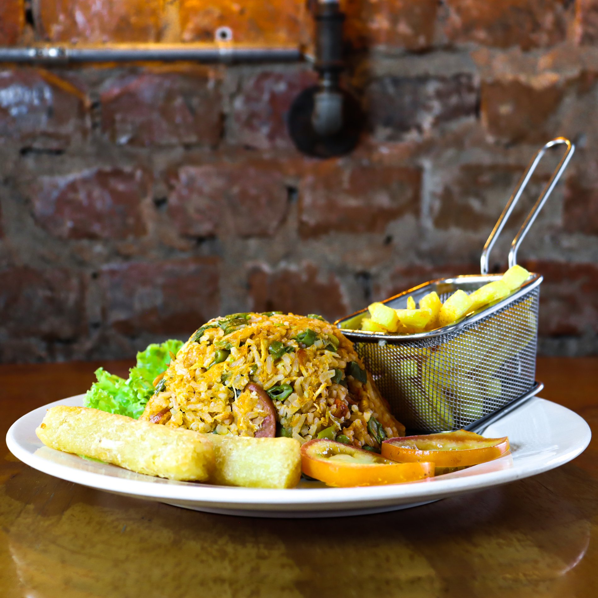 Arroz con pollo acompañado de papa a la francesa, yuca crocante y tomate fresco