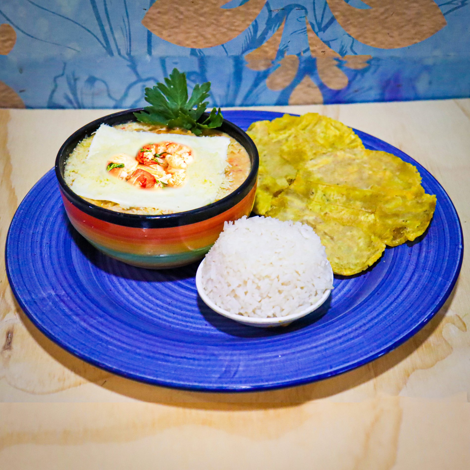 Cazuela de mariscos, llena de sabor, acompañado de arroz y patacón.