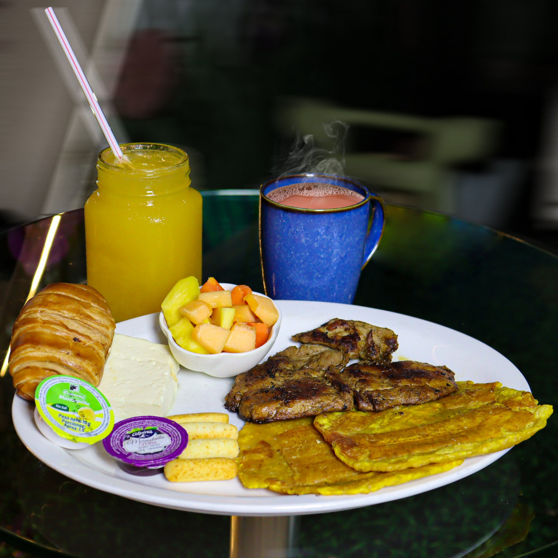 Carne de cerdo asada, gallina, tíscoco de arroz, papa salada, patacón, bebida caliente, jugo natural, porción de frutas, pan y mermelada o mantequilla